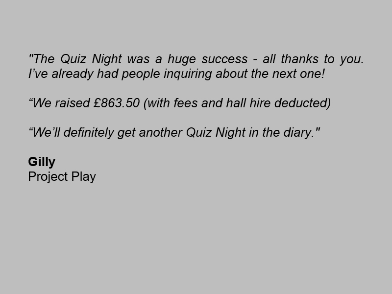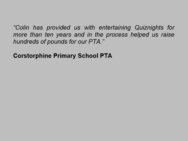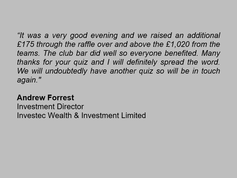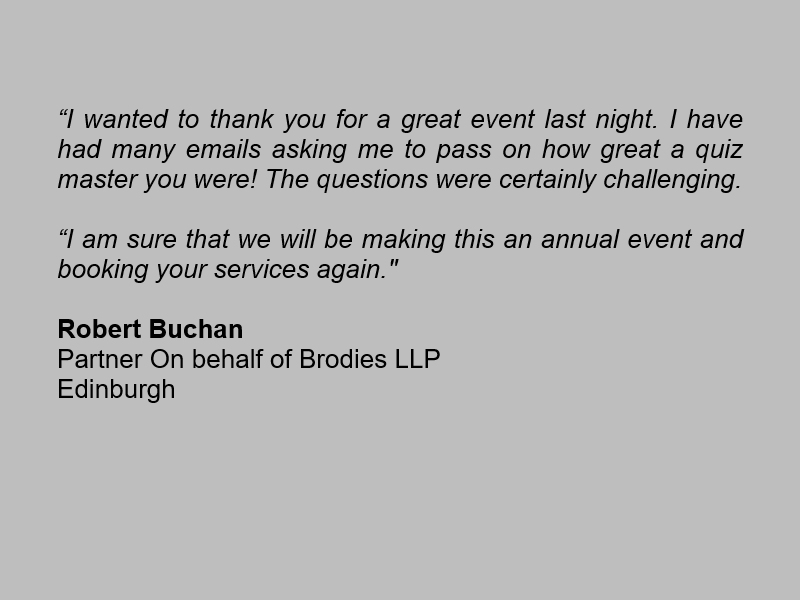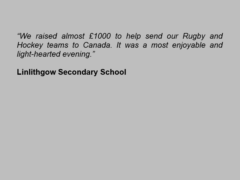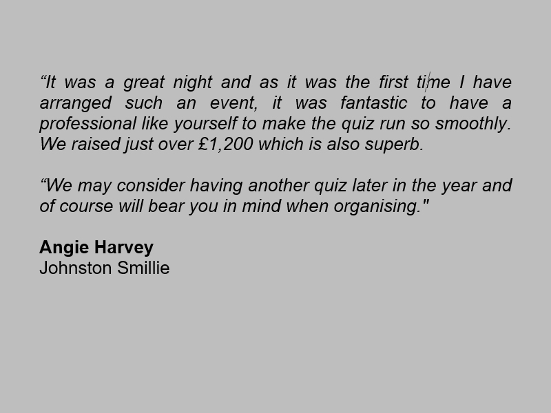 Numerous schools, clubs and organisations throughout Scotland have booked one of our Quiznights and enjoyed a really fun night. We guarantee that you will raise lots of money for your cause and in most cases, more than cover the cost of the booking . Don’t just take our word for it though, the following are quotes from quizzes we have previously presented.